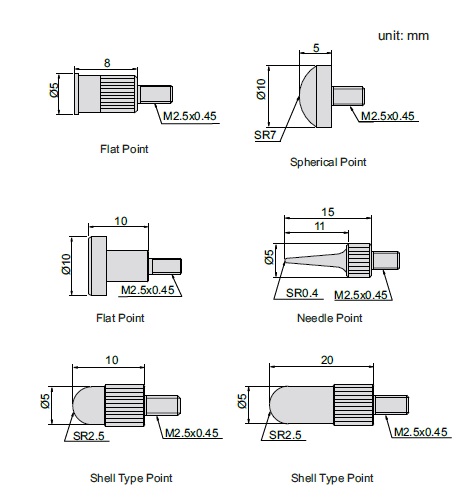 Zestaw końcówek do czujnika, wykonanych ze stali o wymiarach podanych na rysunkach poniżej. W zestawie znajduje się 6 sztuk końcówek: płaskie, sferyczne oraz igłowe.