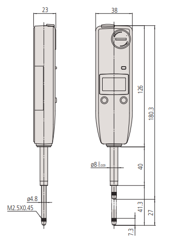Czujnik elektroniczny typu ID-U o zakresie pomiaru 25,4 mm oraz rozdzielczości 0,01 mm. Posiada funkcję ABSOLUTE oraz gniazdo wyjścia danych Digimatic. Jego wąska budowa sprawia, że bardzo dobrze nadaje się do instalacji w czujnikowych stanowiskach pomiarowych. Końcówka pomiarowa wykonana jest z węglika. Wyposażony został również w sygnalizator niskiego napięcia i błędu kompozycji wartości zliczanej.