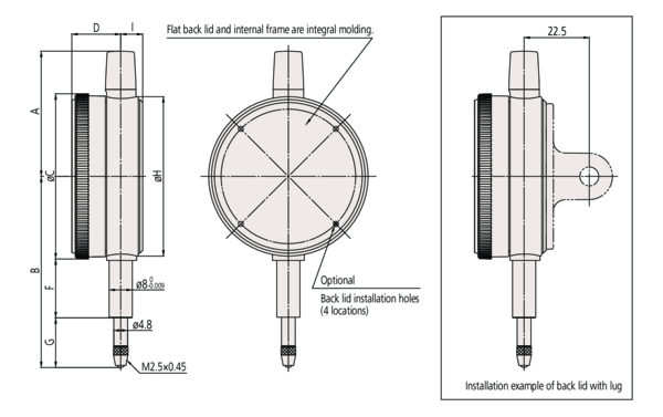 Czujnik zegarowy o zakresie pomiaru 1 mm oraz podziałce 0,01 mm. Średnica tarczy wynosi Ø57 mm. Ograniczona liczba obrotów (do jednego na pełny posuw wrzeciona), pozwala zniwelować błąd odczytu.